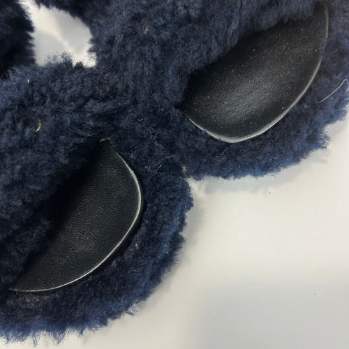 Fabulous and unworn - navy fluffy shearling flatbed sandals with chunky gold buckles. Fully adjustable. No box or dustbags.