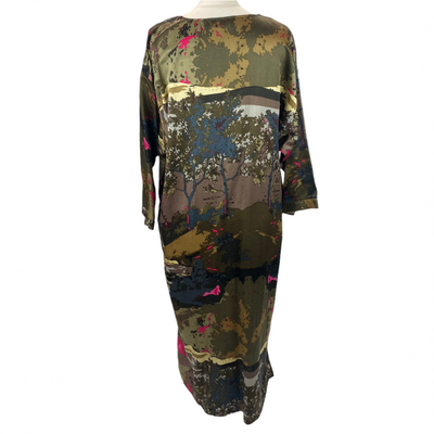 The most beautiful digital print of a rural landscape in soft muted colours with a few flashes of flamingo pink. Made of a midweight satin viscose. Slips on and has side split seams.