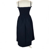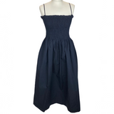 Lena shirred cotton midi dress in navy by Three Graces London. In perfect pre-loved condition.