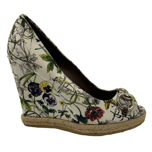 Gucci Canvas Floral Horesbit Open Toe Wedges 38