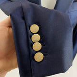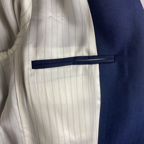 Perfect classic mohair mix jacket with an incredible softness and sheen to the fabric. Finished with an engraved matt gold button. Front flap pockets. Inside pocket still stitched shut. Lined in pinstripe.
